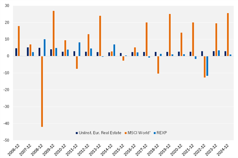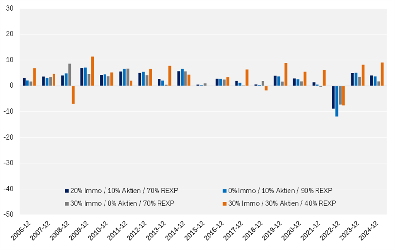Die erste Abbildung zeigt die Performanceentwicklung des Immobilienfonds UniInstitutional European Real Estate, des Aktienindex MSCI World sowie des Rentenindex REXP seit dem Jahr 2006. In der zweiten Abbildung sind verschiedene Zielportfolios dargestellt, die sich durch unterschiedliche Gewichtungen dieser Assetklassen unterscheiden. Im Vergleich zu den isoliert betrachteten Anlageklassen weisen die allokierten Zielportfolios deutlich geglättete Renditeverläufe und geringere Volatilitäten auf. Auch der maximale Verlust in Krisenjahren, wie etwa 2008 oder 2022, fällt dank der Diversifikationseffekte spürbar geringer aus.