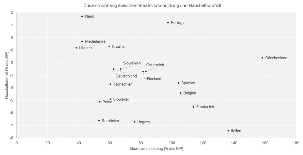 Die folgende Grafik zeigt den Vergleich einiger Euroländer hinsichtlich ihrer Schuldenquoten und Haushaltsdefizite.