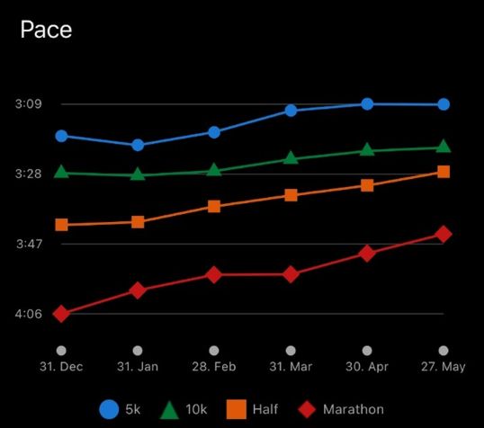 Grafik 1: Quelle: Garmin-App, Schätzung der Zeit pro Kilometer auf geläufige Wettkampfdistanzen