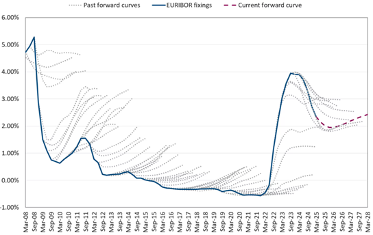 Grafik 3: Quelle: Chatham Financial, 3-Monats-EURIBOR vs. historische Forward-Kurven